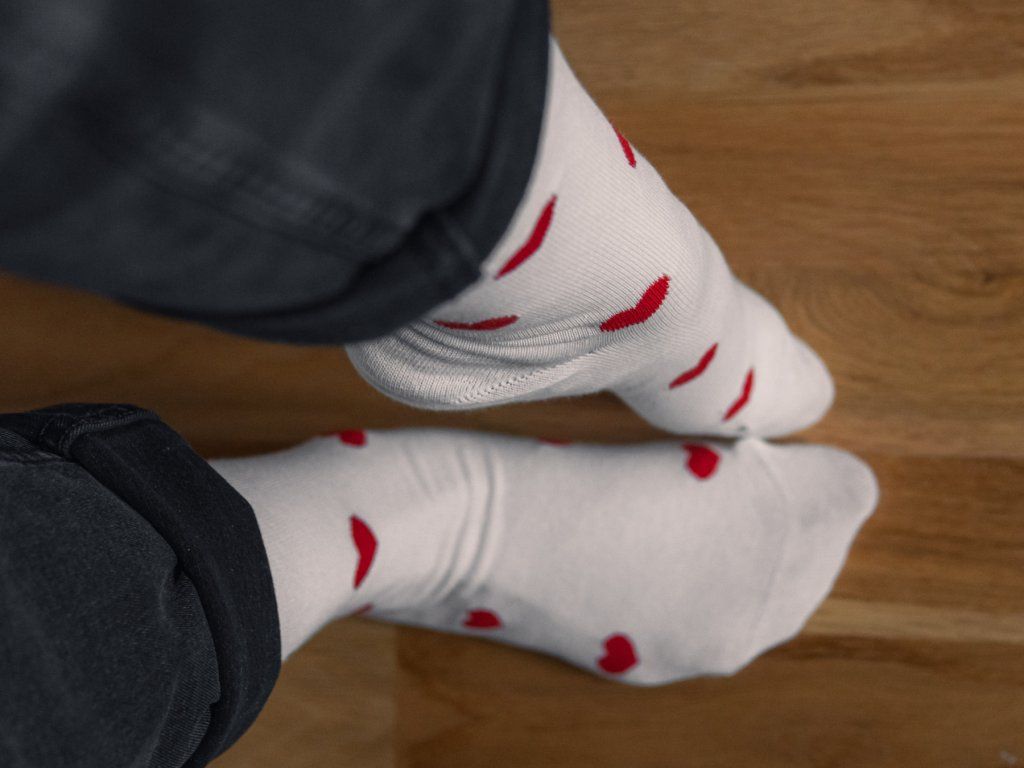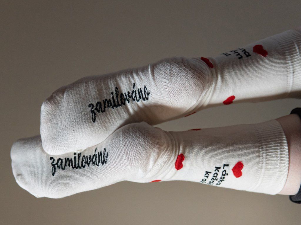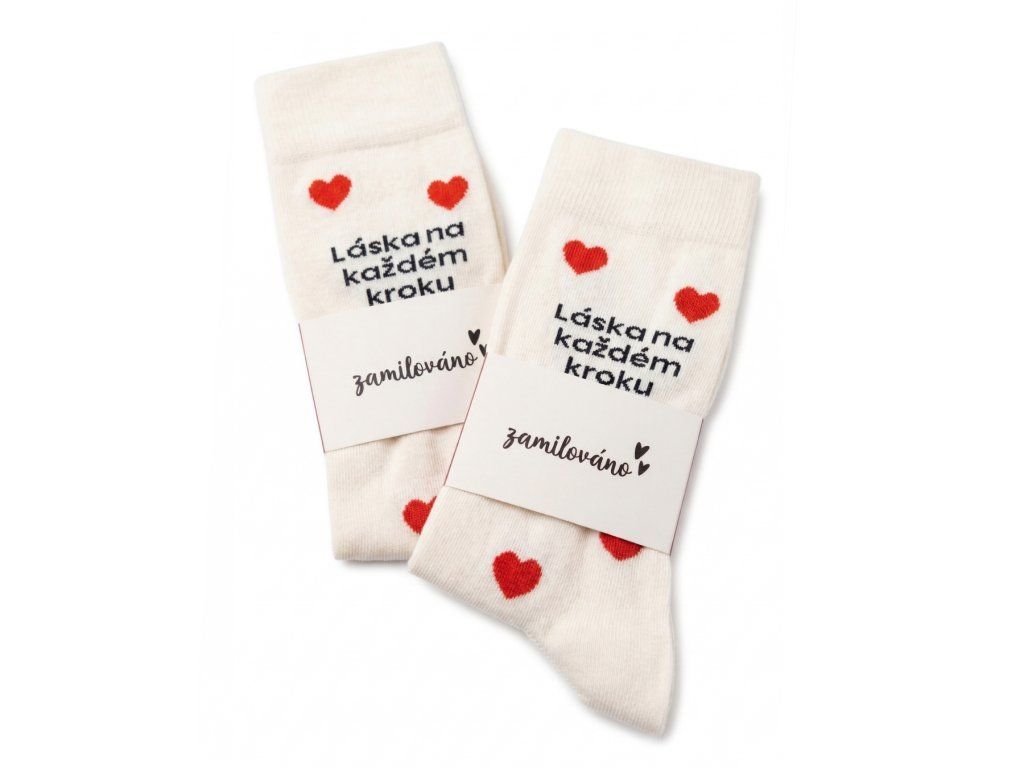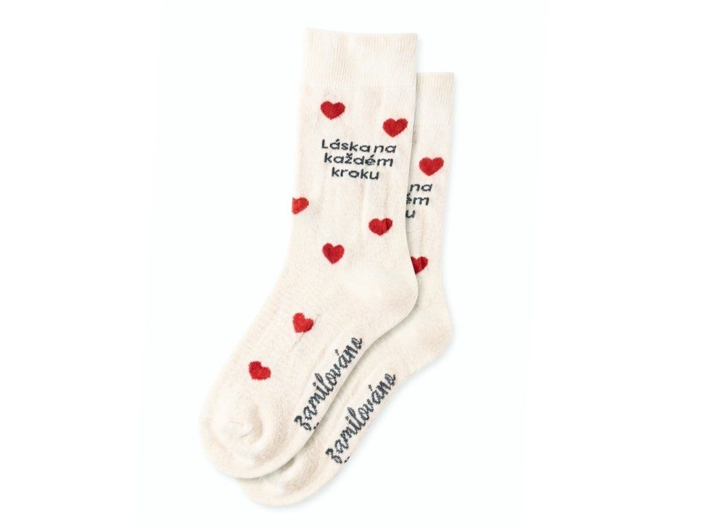 Ponožky s jemným motivem srdíček a nápisem „Láska na každém kroku“.